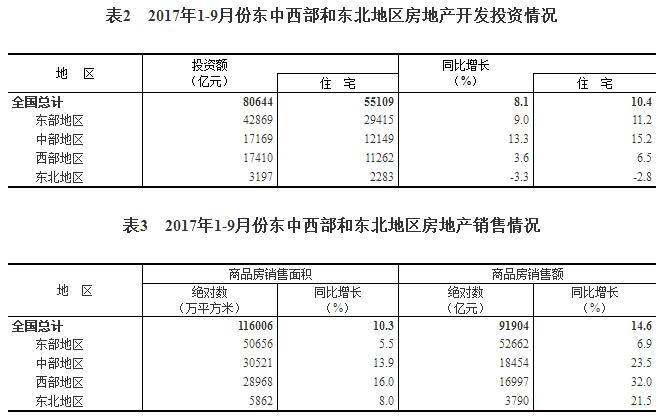 1-9月份,东部地区房地产开发投资42869亿元,同比增长9.0%,增速比1-8月份提高0.2个百分点;中部地区投资17169亿元,增长13.3%,增速与1-8月份持平;西部地区投资17410亿元,增长3.6%,增速回落0.4个百分点;东北地区投资3197亿元,下降3.3%,降幅收窄4.1个百分点。