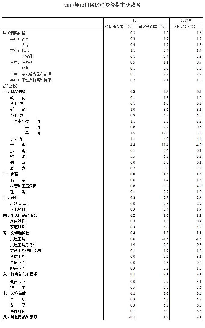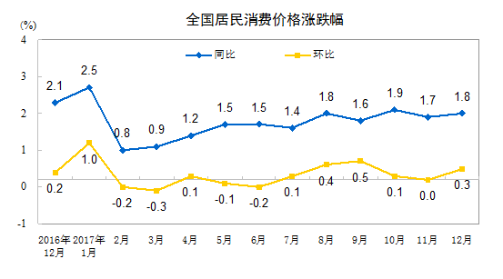2017年12月份,全国居民消费价格同比上涨1.8%。其中,城市上涨1.9%,农村上涨1.7%;食品价格下降0.4%,非食品价格上涨2.4%;消费品价格上涨1.1%,服务价格上涨3.0%。