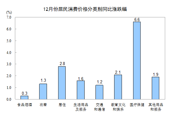 12月份,其他七大类价格同比均上涨。其中,医疗保健、居住、教育文化和娱乐价格分别上涨6.6%、2.8%和2.1%,其他用品和服务、生活用品及服务价格分别上涨1.9%和1.6%,衣着、交通和通信价格分别上涨1.3%和1.2%。