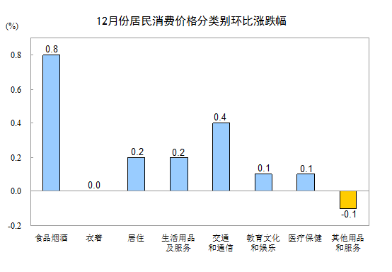 12月份,全国居民消费价格环比上涨0.3%。其中,城市上涨0.3%,农村上涨0.4%;食品价格上涨1.1%,非食品价格上涨0.1%;消费品价格上涨0.5%,服务价格上涨0.1%。