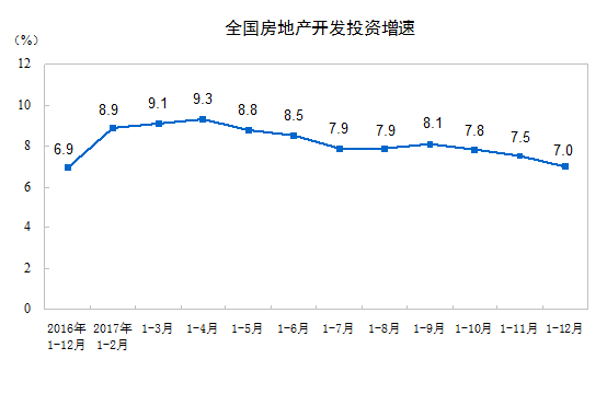 2017年,全国房地产开发投资109799亿元,比上年名义增长7.0%,增速比1-11月份回落0.5个百分点。其中,住宅投资75148亿元,增长9.4%,增速回落0.3个百分点。住宅投资占房地产开发投资的比重为68.4%。