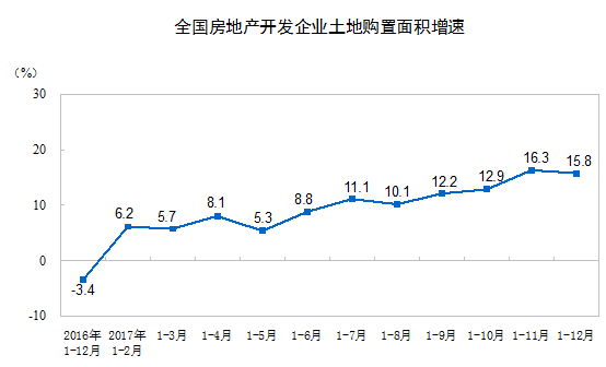 2017年,房地产开发企业土地购置面积25508万平方米,比上年增长15.8%,增速比1-11月份回落0.5个百分点;土地成交价款13643亿元,增长49.4%,增速提高2.4个百分点。