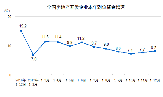 2017年,房地产开发企业到位资金156053亿元,比上年增长8.2%,增速比1-11月份提高0.5个百分点。其中,国内贷款25242亿元,增长17.3%;利用外资168亿元,增长19.8%;自筹资金50872亿元,增长3.5%;其他资金79770亿元,增长8.6%。在其他资金中,定金及预收款48694亿元,增长16.1%;个人按揭贷款23906亿元,下降2.0%。