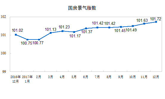 12月份,房地产开发景气指数(简称“国房景气指数”)为101.72,比11月份提高0.09点。