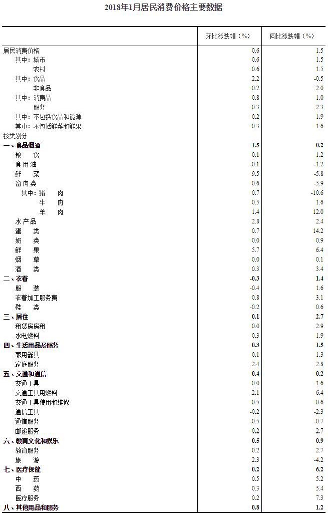 2018年1月份,全国居民消费价格同比上涨1.5%。其中,城市上涨1.5%,农村上涨1.5%;食品价格下降0.5%,非食品价格上涨2.0%;消费品价格上涨1.0%,服务价格上涨2.3%。