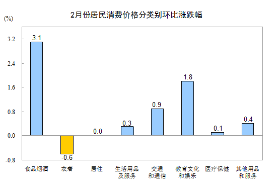2月份,全国居民消费价格环比上涨1.2%。其中,城市上涨1.3%,农村上涨1.1%;食品价格上涨4.4%,非食品价格上涨0.5%;消费品价格上涨1.4%,服务价格上涨1.0%。