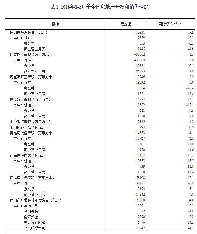 2月末,商品房待售面积58468万平方米,比去年末减少455万平方米。其中,住宅待售面积减少42万平方米,办公楼待售面积减少71万平方米,商业营业用房待售面积减少362万平方米。