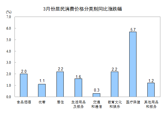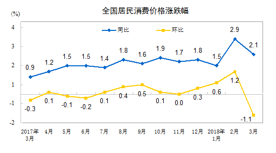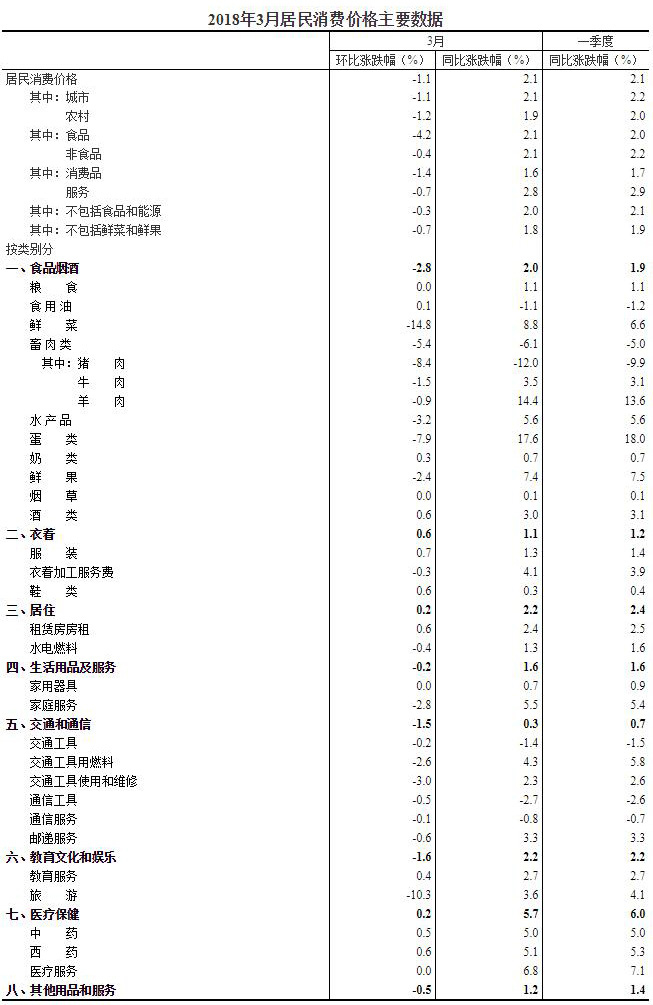 2018年3月份,全国居民消费价格同比上涨2.1%。其中,城市上涨2.1%,农村上涨1.9%;食品价格上涨2.1%,非食品价格上涨2.1%;消费品价格上涨1.6%,服务价格上涨2.8%。一季度,全国居民消费价格总水平比去年同期上涨2.1%。。