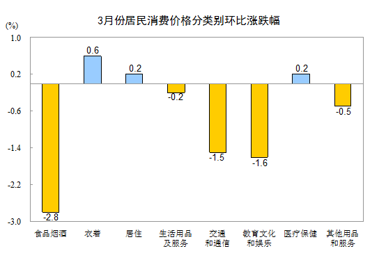 3月份,全国居民消费价格环比下降1.1%。其中,城市下降1.1%,农村下降1.2%;食品价格下降4.2%,非食品价格下降0.4%;消费品价格下降1.4%,服务价格下降0.7%。