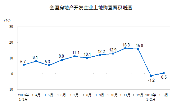 1-3月份,房地产开发企业土地购置面积3802万平方米,同比增长0.5%,1-2月份为下降1.2%;土地成交价款1634亿元,增长20.3%,增速提高20.3个百分点。