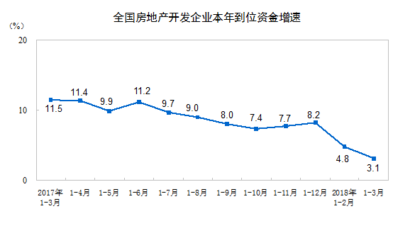 1-3月份,房地产开发企业到位资金36770亿元,同比增长3.1%,增速比1-2月份回落1.7个百分点。其中,国内贷款6957亿元,增长0.9%;利用外资16亿元,下降78.4%;自筹资金11449亿元,增长5.1%;定金及预收款11130亿元,增长11.2%;个人按揭贷款5160亿元,下降6.8%。