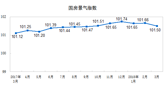 3月份,房地产开发景气指数(简称“国房景气指数”)为101.50,比2月份回落0.16点。