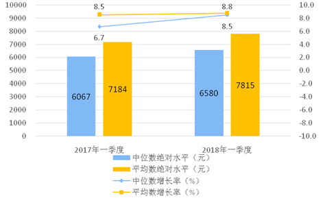 2018年一季度,全国居民人均可支配收入7815元,比上年同期名义增长8.8%,扣除价格因素,实际增长6.6%。其中,城镇居民人均可支配收入10781元,增长(以下如无特别说明,均为同比名义增长)8.0%,扣除价格因素,实际增长5.7%;农村居民人均可支配收入4226元,增长8.9%,扣除价格因素,实际增长6.8%。