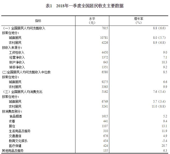 2018年一季度居民收入和消费支出情况