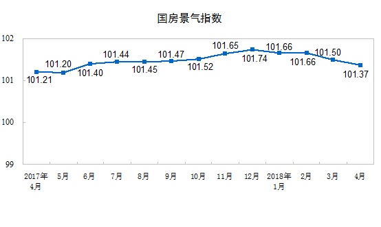 4月份,房地产开发景气指数(简称“国房景气指数”)为101.37,比3月份提高0.13点。