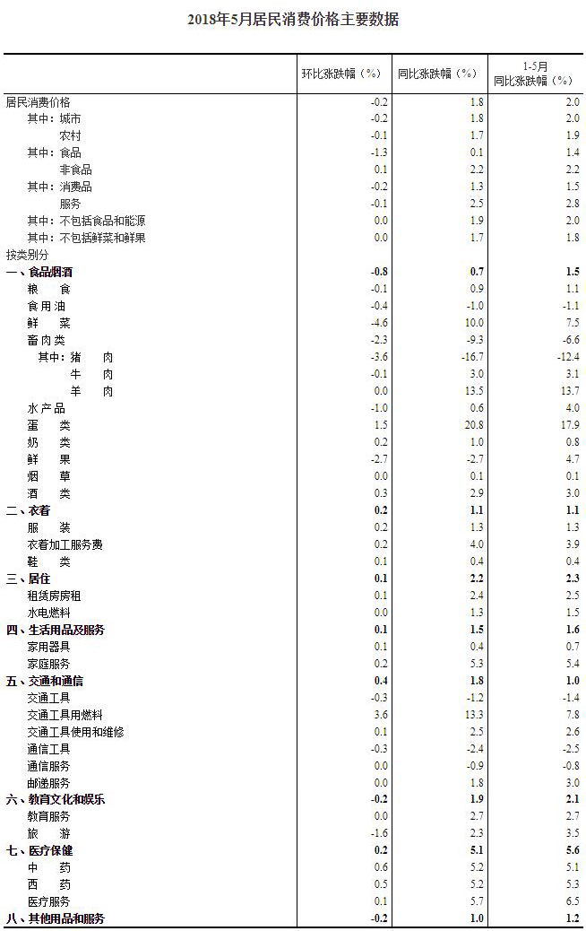 2018年5月份,全国居民消费价格同比上涨1.8%。其中,城市上涨1.8%,农村上涨1.7%;食品价格上涨0.1%,非食品价格上涨2.2%;消费品价格上涨1.3%,服务价格上涨2.5%。1-5月平均,全国居民消费价格比去年同期上涨2.0%。