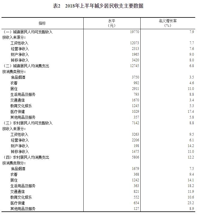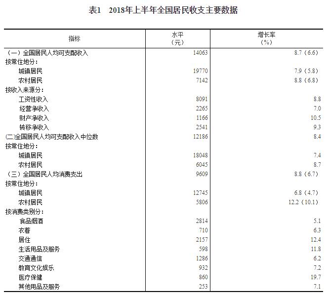 2018年上半年,全国居民人均可支配收入14063元,比上年同期名义增长8.7%,扣除价格因素,实际增长6.6%。其中,城镇居民人均可支配收入19770元,增长(以下如无特别说明,均为同比名义增长) 7.9%,扣除价格因素,实际增长5.8%;农村居民人均可支配收入7142元,增长8.8%,扣除价格因素,实际增长6.8%。