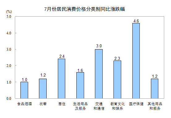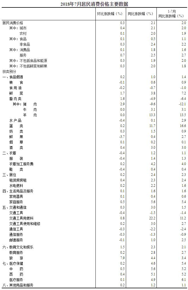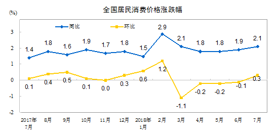 2018年7月份居民消费价格同比上涨2.1%