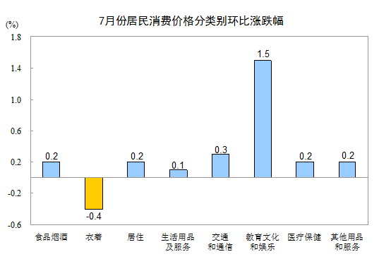 7月份,全国居民消费价格环比上涨0.3%。其中,城市上涨0.4%,农村上涨0.1%;食品价格上涨0.1%,非食品价格上涨0.3%;消费品价格上涨0.1%,服务价格上涨0.7%。