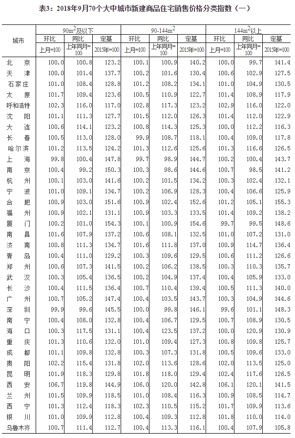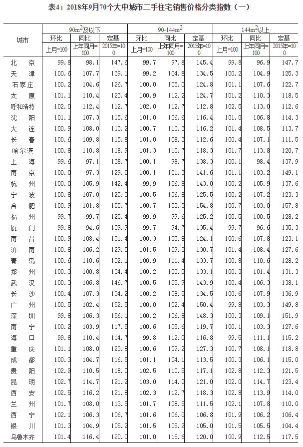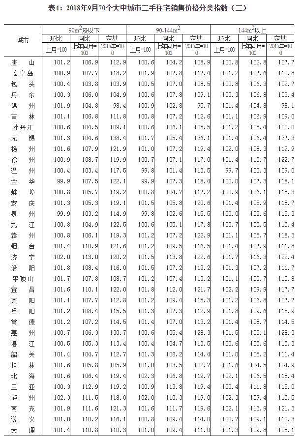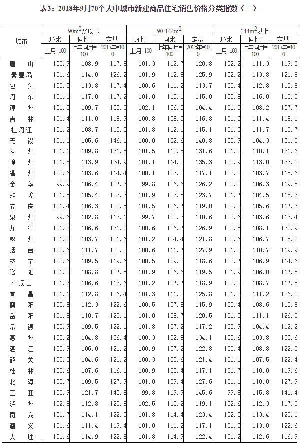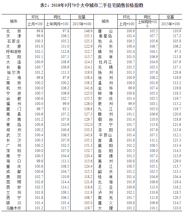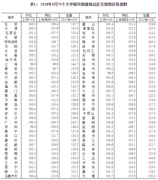 2018年9月份70个大中城市商品住宅销售价格变动情况