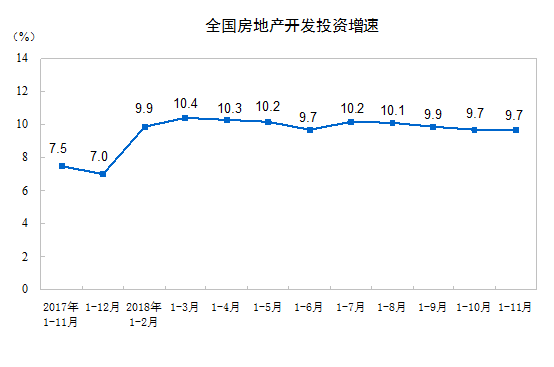 2018年1-11月份,全国房地产开发投资110083亿元,同比增长9.7%,增速与1-10月份持平。其中,住宅投资78027亿元,增长13.6%,增速回落0.1个百分点。住宅投资占房地产开发投资的比重为70.9%。
