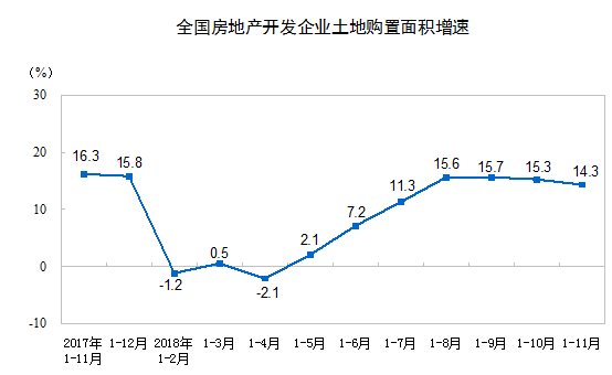 1-11月份,房地产开发企业土地购置面积25326万平方米,同比增长14.3%,增速比1-10月份回落1个百分点;土地成交价款13746亿元,增长20.2%,增速回落0.4个百分点。