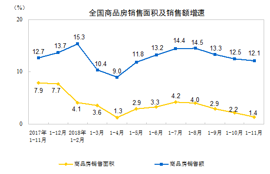 1-11月份,商品房销售面积148604万平方米,同比增长1.4%,增速比1-10月份回落0.8个百分点。其中,住宅销售面积增长2.1%,办公楼销售面积下降11.1%,商业营业用房销售面积下降5.1%。商品房销售额129508亿元,增长12.1%,增速回落0.4个百分点。其中,住宅销售额增长14.8%,办公楼销售额下降6.4%,商业营业用房销售额下降0.2%。