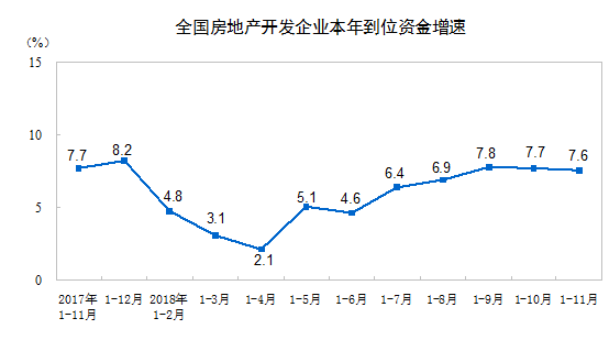 1-11月份,房地产开发企业到位资金150077亿元,同比增长7.6%,增速比1-10月份回落0.1个百分点。其中,国内贷款21807亿元,下降3.7%;利用外资102亿元,下降30.4%;自筹资金50619亿元,增长10.0%;定金及预收款49551亿元,增长15.7%;个人按揭贷款21420亿元,下降0.9%。