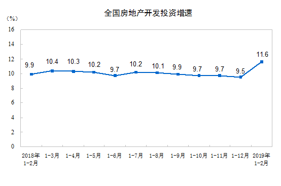 2019年1-2月份,全国房地产开发投资12090亿元,同比增长11.6%,增速比2018年全年提高2.1个百分点。其中,住宅投资8711亿元,增长18.0%,增速提高4.6个百分点。住宅投资占房地产开发投资的比重为72.1%。