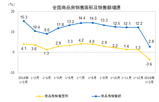 1-2月份,商品房销售面积14102万平方米,同比下降3.6%,2018年全年为增长1.3%。其中,住宅销售面积下降3.2%,办公楼销售面积下降15.7%,商业营业用房销售面积下降13.6%。商品房销售额12803亿元,增长2.8%,增速回落9.4个百分点。其中,住宅销售额增长4.5%,办公楼销售额下降6.2%,商业营业用房销售额下降9.4%。