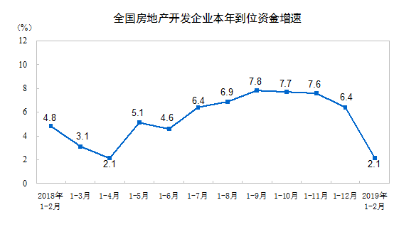 1-2月份,房地产开发企业到位资金24497亿元,同比增长2.1%,增速比2018年全年回落4.3个百分点。其中,国内贷款4976亿元,下降0.5%;利用外资52亿元,增长3.3倍;自筹资金7279亿元,下降1.5%;定金及预收款7366亿元,增长5.6%;个人按揭贷款3458亿元,增长6.5%。