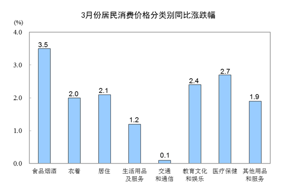 3月份,食品烟酒价格同比上涨3.5%,影响CPI(居民消费价格指数)上涨约1.04个百分点。其中,鲜菜价格上涨16.2%,影响CPI上涨约0.42个百分点;鲜果价格上涨7.7%,影响CPI上涨约0.14个百分点;畜肉类价格上涨4.7%,影响CPI上涨约0.20个百分点(猪肉价格上涨5.1%,影响CPI上涨约0.12个百分点);禽肉类价格上涨4.0%,影响CPI上涨约0.05个百分点;粮食价格上涨0.4%,影响CPI上涨约0.01个百分点;鸡蛋价格下降4.1%,影响CPI下降约0.02个百分点;水产品价格下降3.0%,影响CPI下降约0.06个百分点。