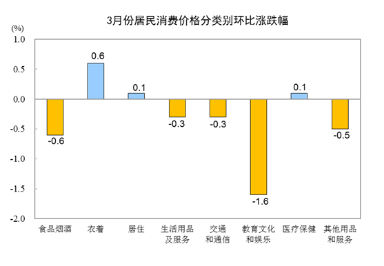 3月份,全国居民消费价格环比下降0.4%。其中,城市下降0.4%,农村下降0.3%;食品价格下降0.9%,非食品价格下降0.2%;消费品价格下降0.1%,服务价格下降0.8%。