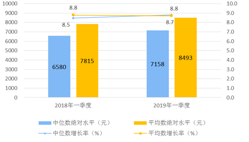2019年一季度,全国居民人均可支配收入8493元,比上年同期名义增长8.7%,扣除价格因素,实际增长6.8%。其中,城镇居民人均可支配收入11633元,增长(以下如无特别说明,均为同比名义增长)7.9%,扣除价格因素,实际增长5.9%;农村居民人均可支配收入4600元,增长8.8%,扣除价格因素,实际增长6.9%。