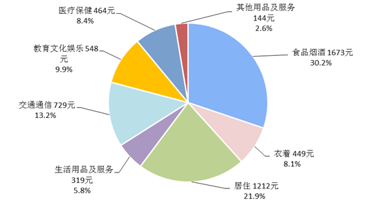 一季度,全国居民人均食品烟酒消费支出1673元,增长3.6%,占人均消费支出的比重为30.2%;人均衣着消费支出449元,增长1.7%,占人均消费支出的比重为8.1%;人均居住消费支出1212元,增长9.5%,占人均消费支出的比重为21.9%;人均生活用品及服务消费支出319元,增长3.1%,占人均消费支出的比重为5.8%;人均交通通信消费支出729元,增长7.8%,占人均消费支出的比重为13.2%;人均教育文化娱乐消费支出548元,增长20.6%,占人均消费支出的比重为9.9%;人均医疗保健消费支出464元,增长9.3%,占人均消费支出的比重为8.4%;人均其他用品及服务消费支出144元,增长7.1%,占人均消费支出的比重为2.6%。