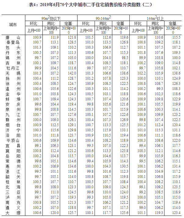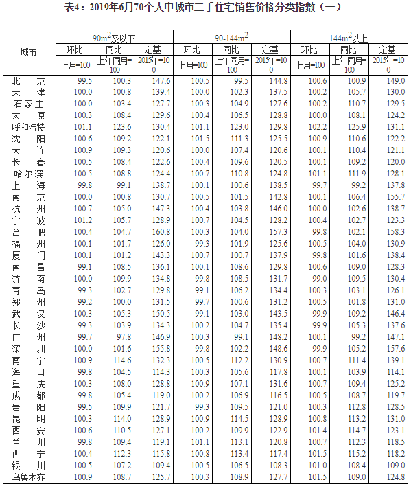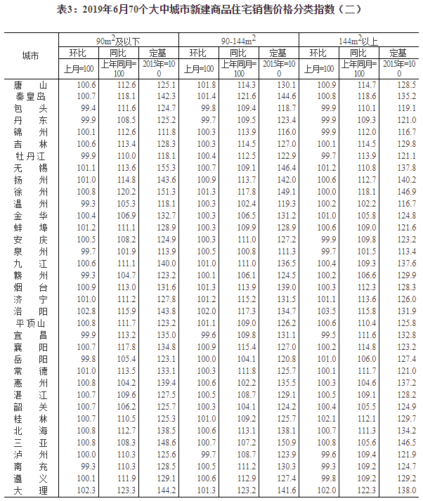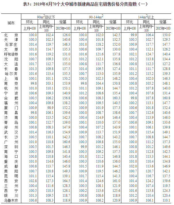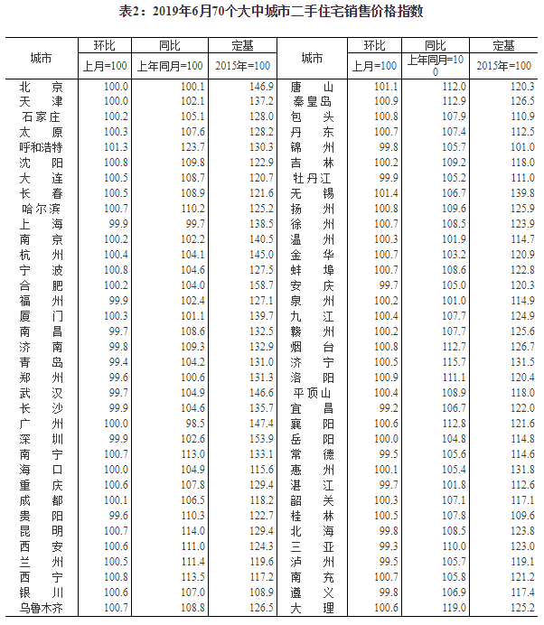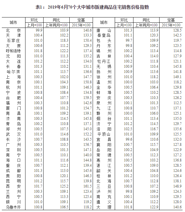 2019年6月份70个大中城市商品住宅销售价格变动情况
