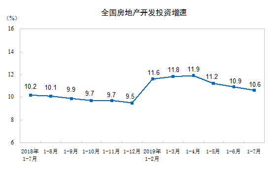 2019年1—7月份,全国房地产开发投资72843亿元,同比增长10.6%,增速比1—6月份回落0.3个百分点。其中,住宅投资53466亿元,增长15.1%,增速回落0.7个百分点。住宅投资占房地产开发投资的比重为73.4%。