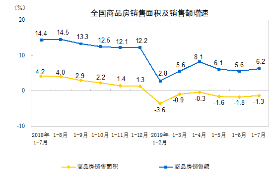 1—7月份,商品房销售面积88783万平方米,同比下降1.3%,降幅比1—6月份收窄0.5个百分点。其中,住宅销售面积下降0.4%,办公楼销售面积下降10.8%,商业营业用房销售面积下降13.1%。商品房销售额83162亿元,增长6.2%,增速加快0.6个百分点。其中,住宅销售额增长9.2%,办公楼销售额下降13.3%,商业营业用房销售额下降10.9%。