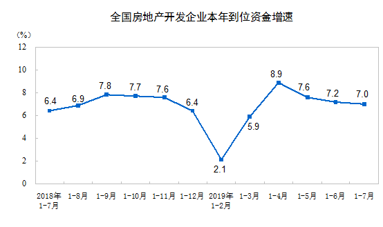 1—7月份,房地产开发企业到位资金99800亿元,同比增长7.0%,增速比1—6月份回落0.2个百分点。其中,国内贷款15377亿元,增长9.5%;利用外资61亿元,增长83.6%;自筹资金31032亿元,增长2.8%;定金及预收款33980亿元,增长9.6%;个人按揭贷款15198亿元,增长11.3%。