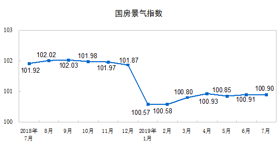 7月份,房地产开发景气指数(简称“国房景气指数”)为100.90,比6月份回落0.01点。