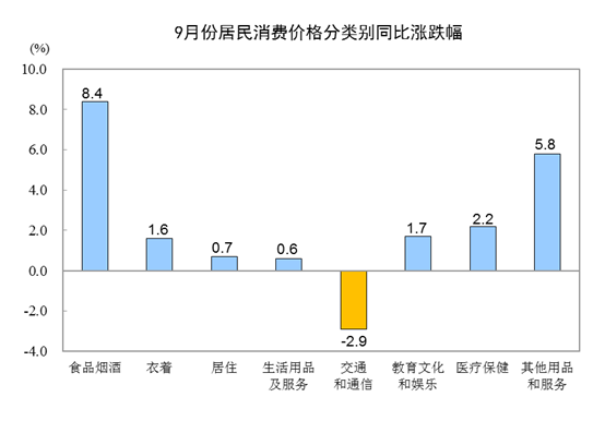 9月份,食品烟酒价格同比上涨8.4%,影响CPI(居民消费价格指数)上涨约2.49个百分点。其中,畜肉类价格上涨46.9%,影响CPI上涨约2.03个百分点(猪肉价格上涨69.3%,影响CPI上涨约1.65个百分点);禽肉类价格上涨14.7%,影响CPI上涨约0.18个百分点;鸡蛋价格上涨9.4%,影响CPI上涨约0.05个百分点;鲜果价格上涨7.7%,影响CPI上涨约0.13个百分点;水产品价格上涨2.9%,影响CPI上涨约0.05个百分点;粮食价格上涨0.6%,影响CPI上涨约0.01个百分点;鲜菜价格下降11.8%,影响CPI下降约0.33个百分点。