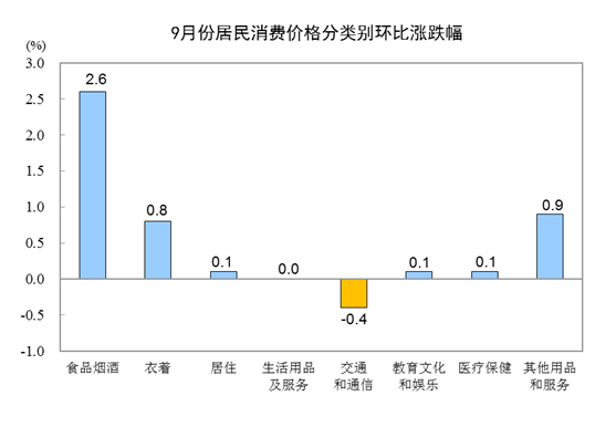 9月份,全国居民消费价格环比上涨0.9%。其中,城市上涨0.7%,农村上涨1.3%;食品价格上涨3.5%,非食品价格上涨0.2%;消费品价格上涨1.5%,服务价格下降0.1%。
