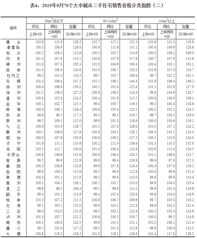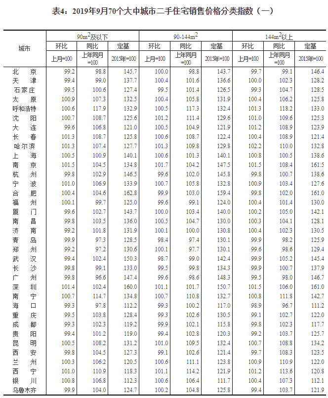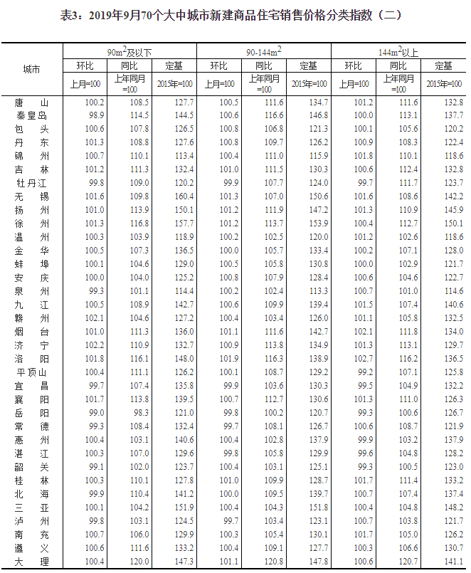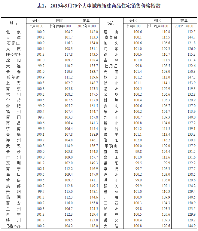 2019年9月份70个大中城市商品住宅销售价格变动情况