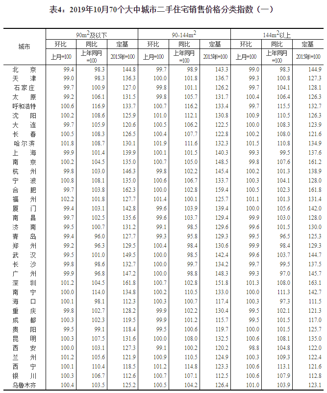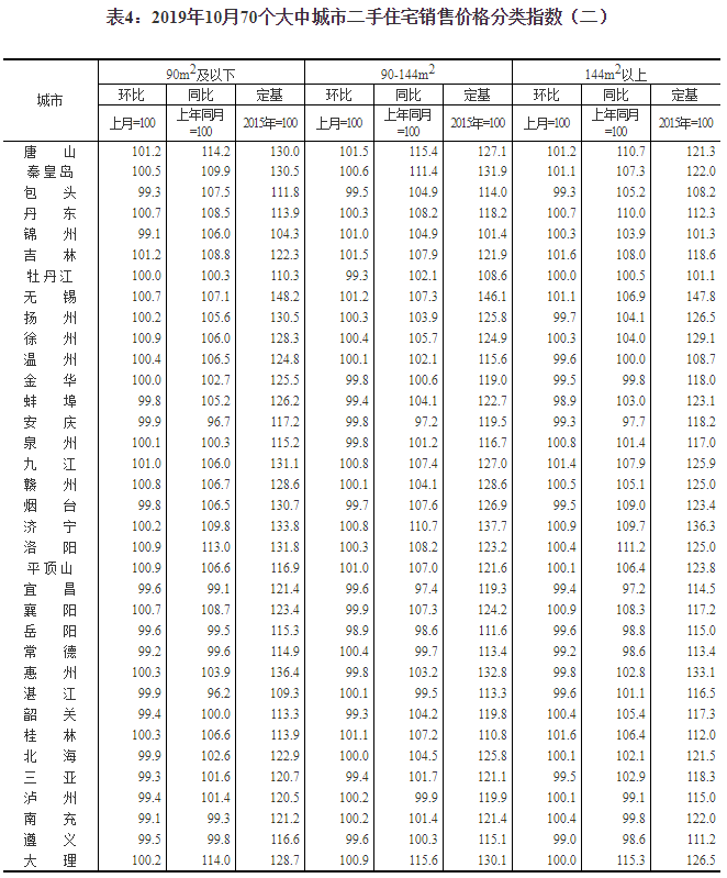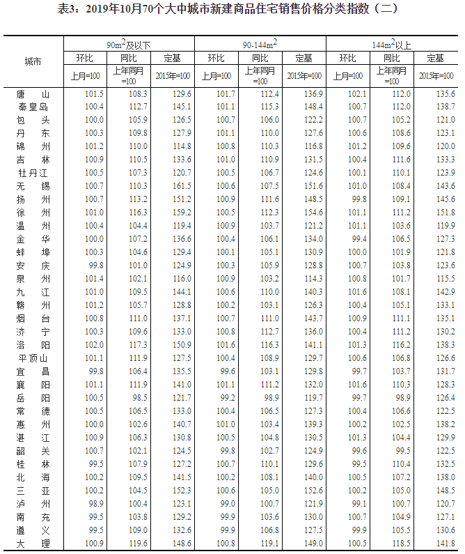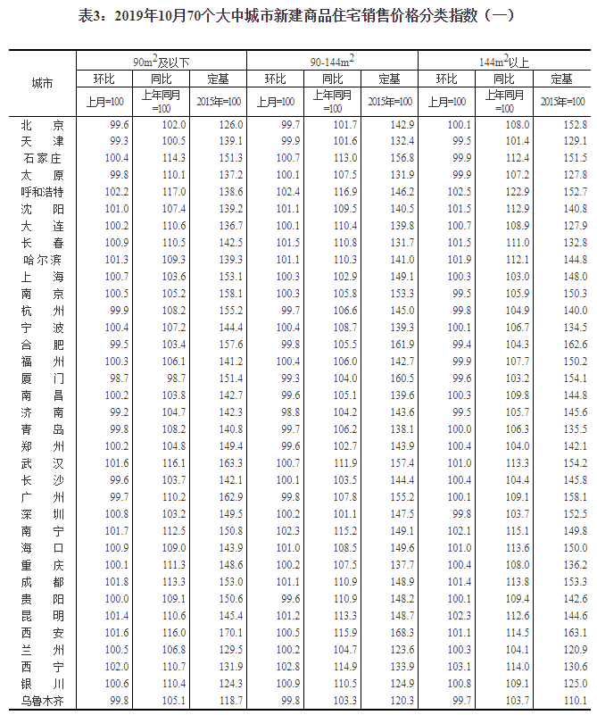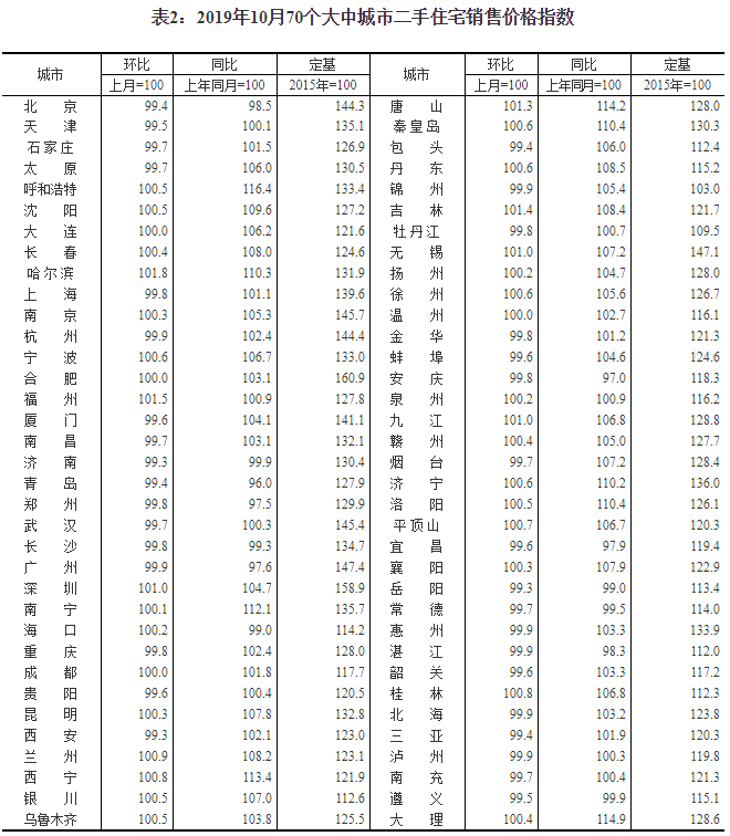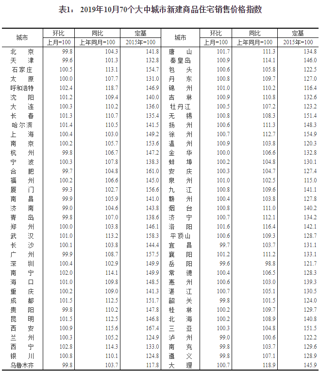 2019年10月份70个大中城市商品住宅销售价格变动情况