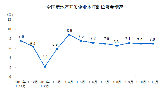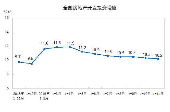 2019年1—11月份,全国房地产开发投资121265亿元,同比增长10.2%,增速比1—10月份回落0.1个百分点。其中,住宅投资89232亿元,增长14.4%,增速回落0.2个百分点。