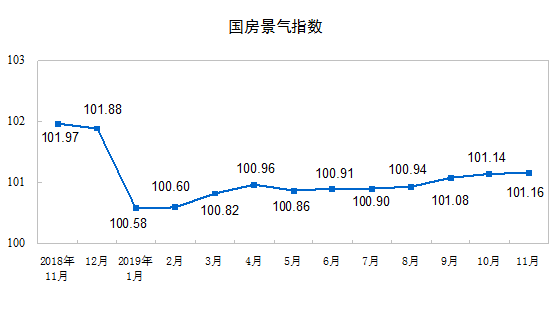 11月份,房地产开发景气指数(简称“国房景气指数”)为101.16,比10月份提高0.02点。