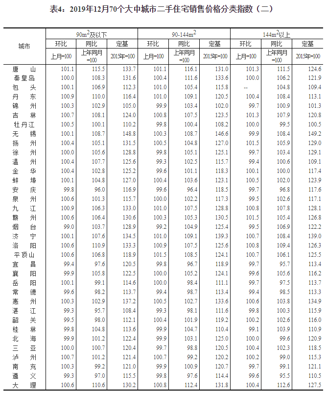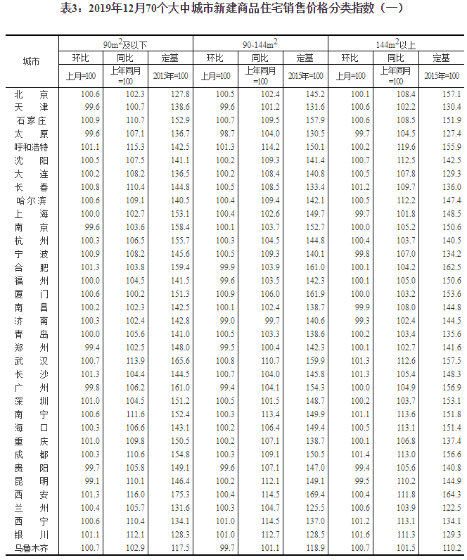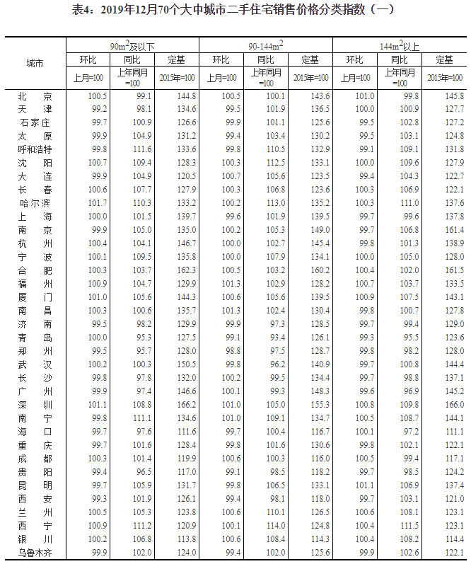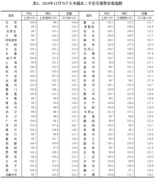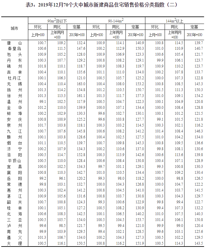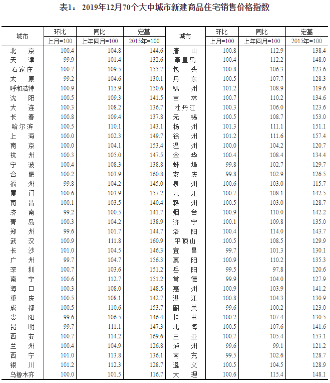 2019年12月份70个大中城市商品住宅销售价格变动情况