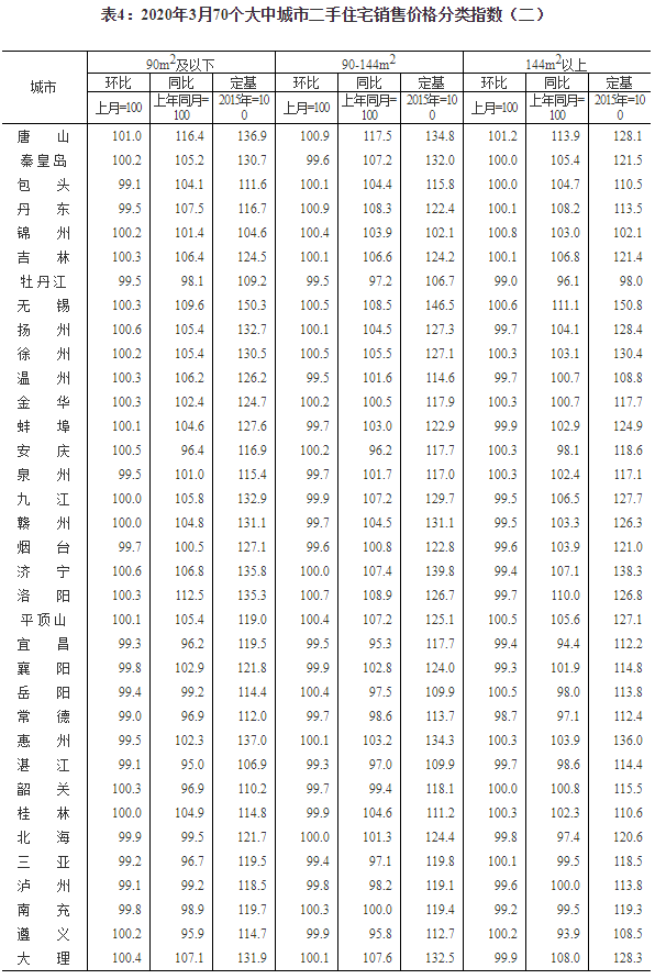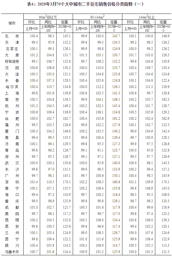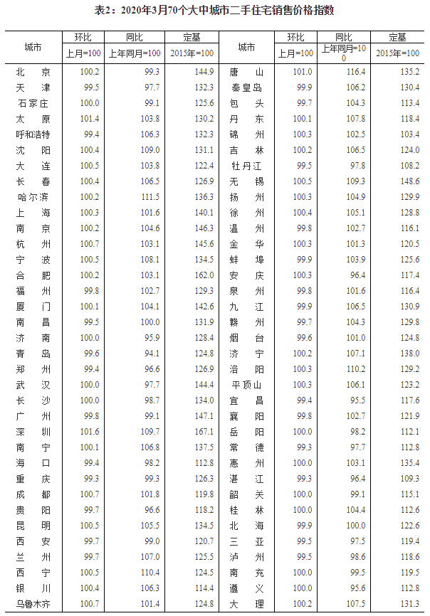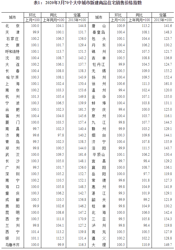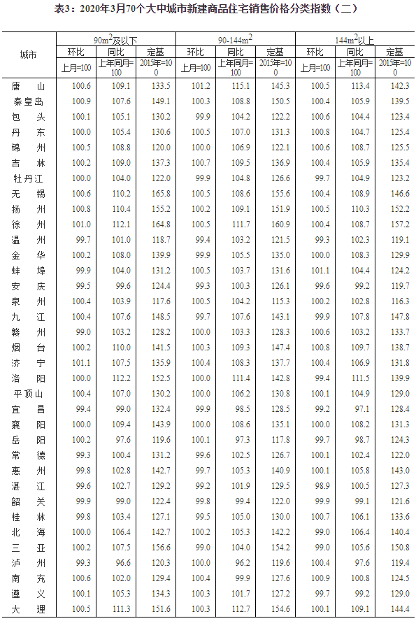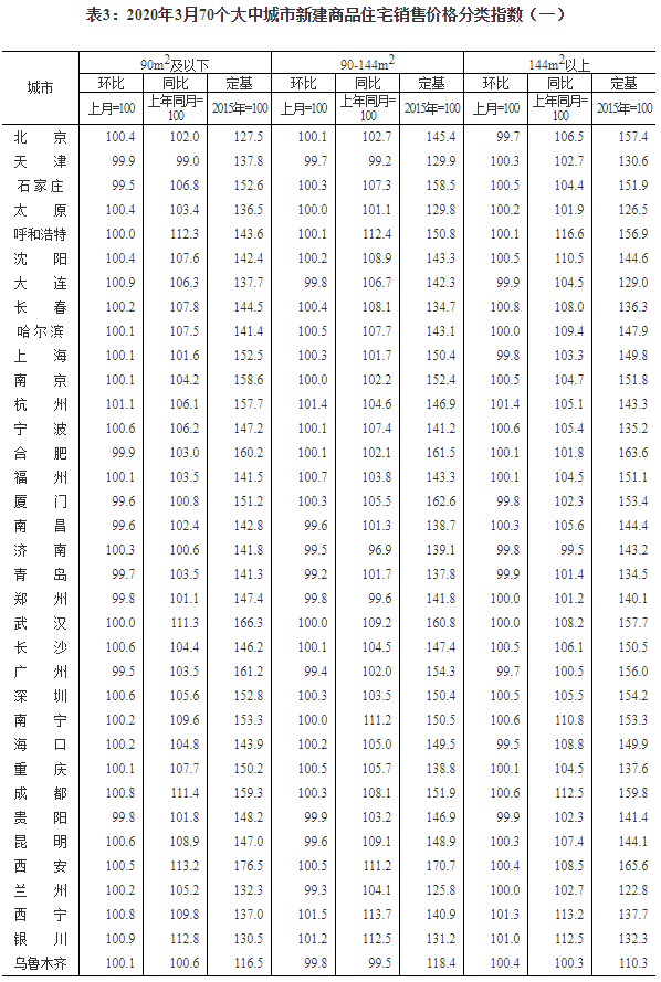 2020年3月份70个大中城市商品住宅销售价格变动情况