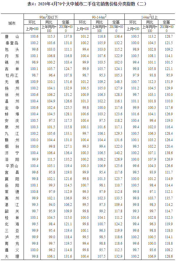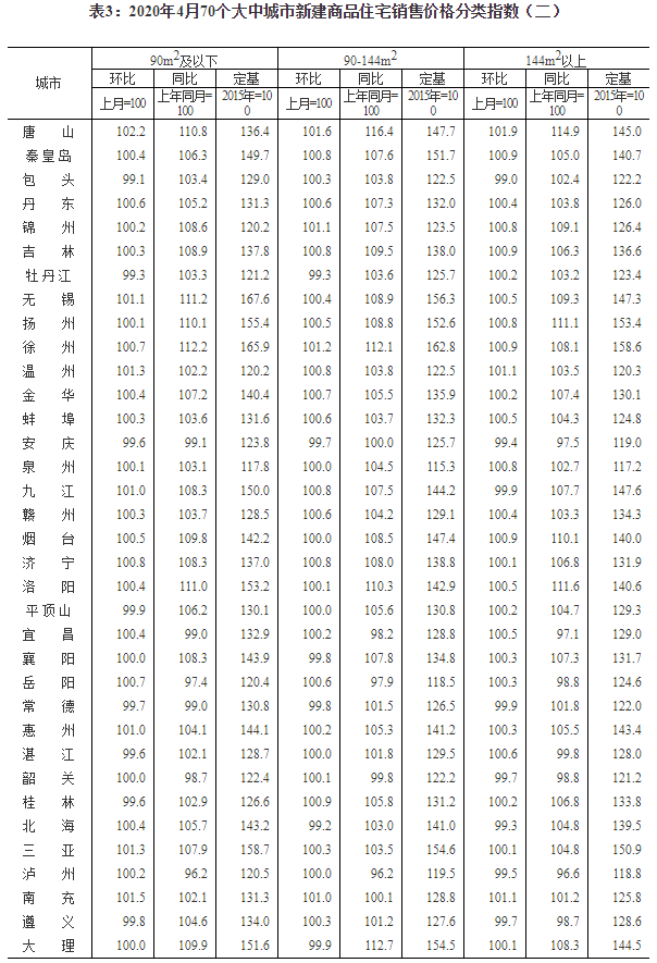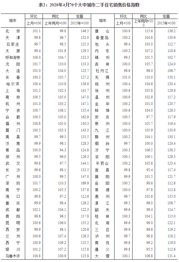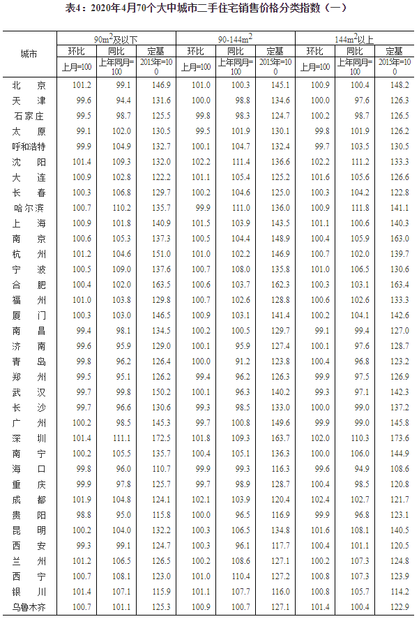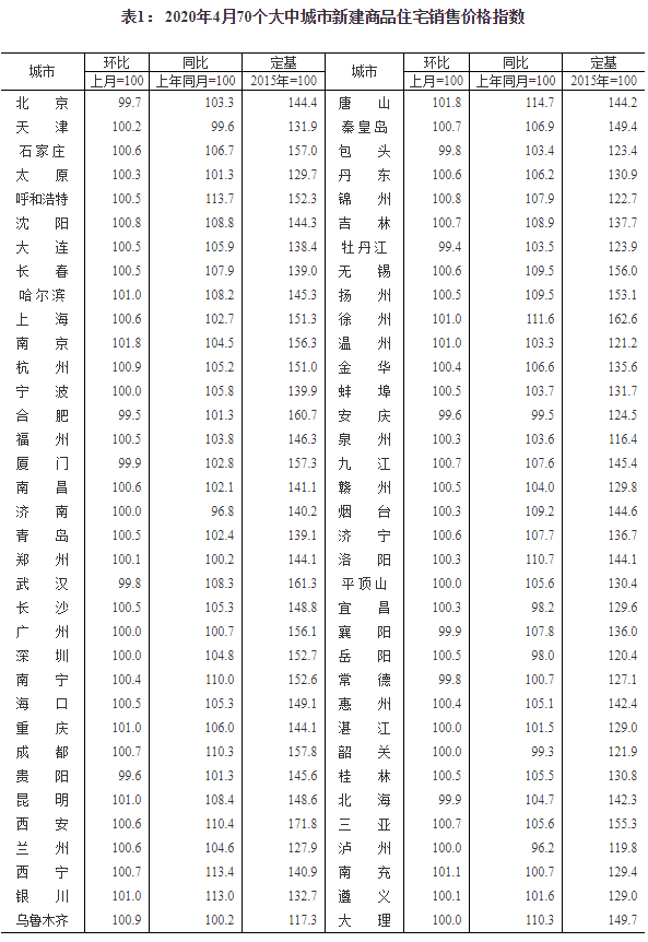 2020年4月份70个大中城市商品住宅销售价格变动情况