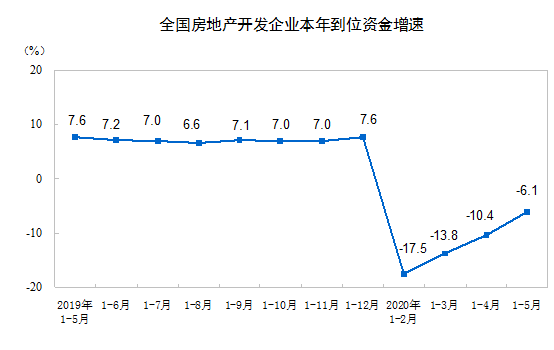 1—5月份,房地产开发企业到位资金62654亿元,同比下降6.1%,降幅比1—4月份收窄4.3个百分点。其中,国内贷款10703亿元,下降0.5%;利用外资34亿元,增长15.3%;自筹资金20106亿元,下降0.8%;定金及预收款19479亿元,下降13.0%;个人按揭贷款10154亿元,下降0.9%。